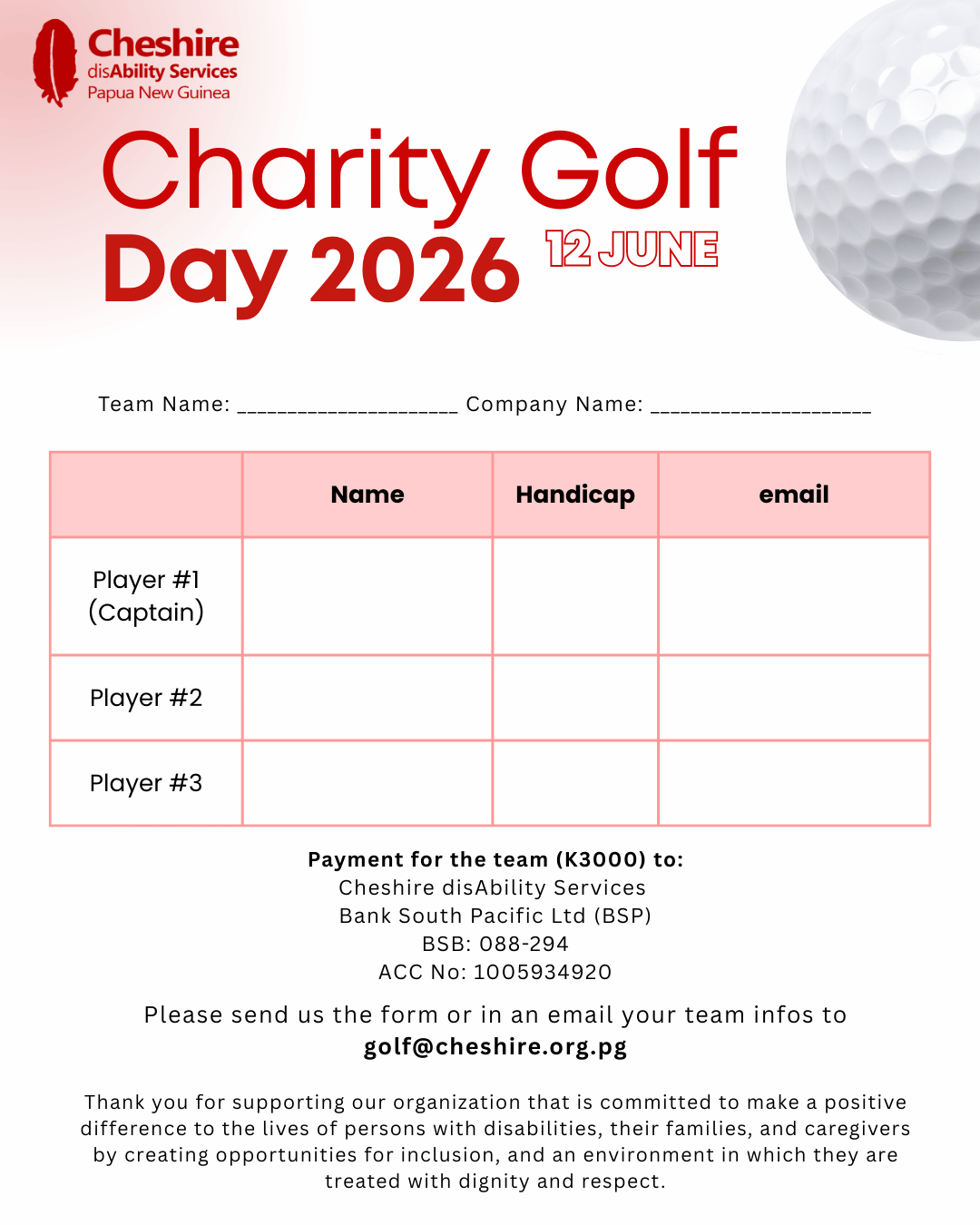 Download registration form here, or just send your 3 players name and with their handicap to golf@cheshire.org.pg.